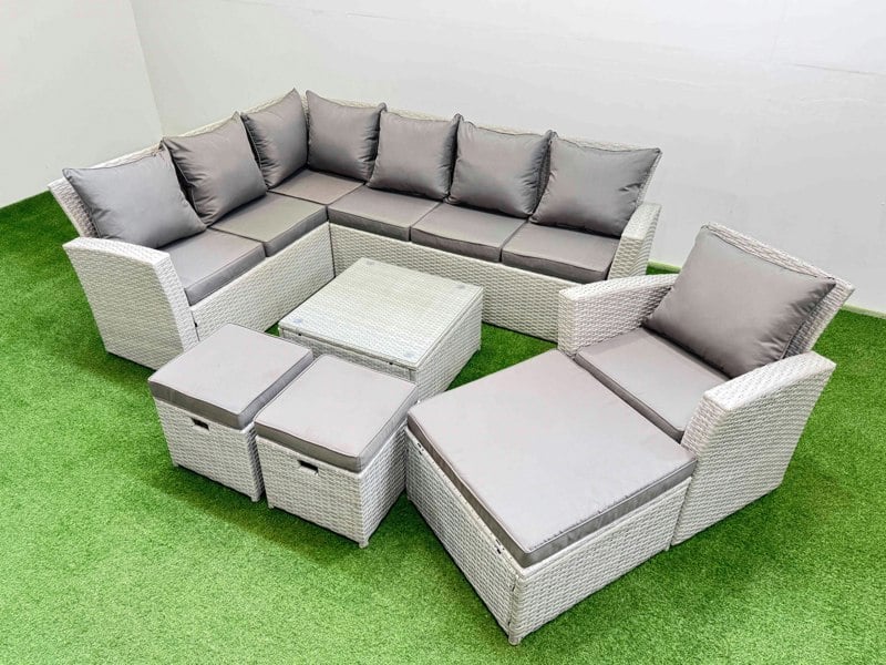 Create a refined outdoor seating area for the courtyard, deck, backyard, porch or poolside with this outdoor rattan garden furniture set. Designed to bring structure and comfort to social spaces, it pairs a light grey mixed rattan finish with dark grey fabric for a coordinated look.