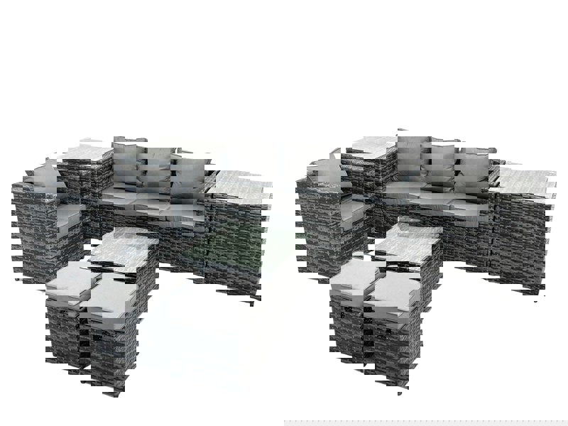 Designed for relaxed outdoor living, this 6 seater rattan garden furniture set brings a sleek, modern look to patios, balconies and gardens. Finished in dark grey mixed rattan with dark grey fabric, it offers a coordinated setting for everyday lounging, casual drinks and outdoor entertaining.