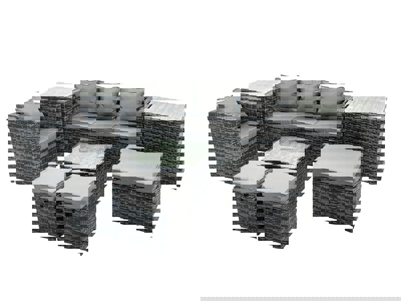 Designed for relaxed outdoor living, this 7 seater rattan garden furniture set brings a sleek, modern look to patios, balconies and garden spaces. Finished in dark grey mixed rattan with dark grey fabric, it offers a coordinated setting for everyday lounging and casual entertaining.