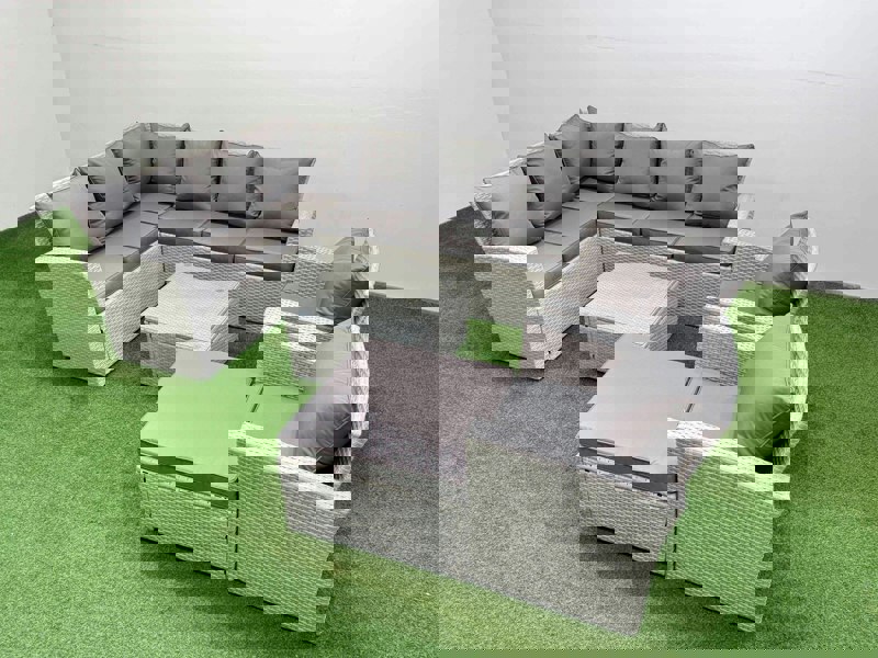 Supplied flat packed for straightforward assembly, the set features an ergonomic high back and reclining design for added comfort. A square coffee table is finished with 5mm thick transparent tempered glass, secured with suckers to help prevent sliding. The light grey mixed rattan is paired with dark grey fabric.