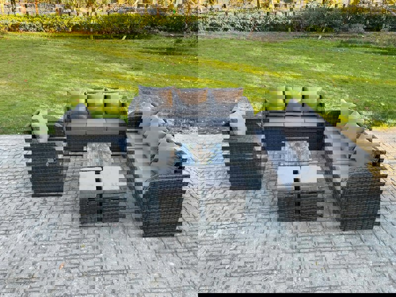 The set features dark grey mixed rattan with matching dark grey fabric cushions, shaped to fit the seating for added comfort. A square coffee table is finished with a tempered glass top, secured with suckers to help prevent sliding.
