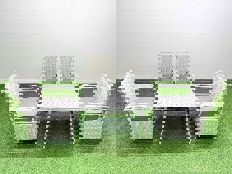 This outdoor rattan garden furniture set is designed for relaxed dining on the patio or in the garden. The set includes 4 chairs and a rectangular dining table, offering a practical layout for everyday meals and outdoor entertaining.