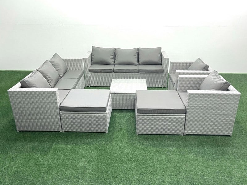 Designed for patio or garden use, this deluxe rattan sofa set creates a comfortable space for outdoor lounging and entertaining. Made with light grey mixed PE rattan and paired with dark grey fabric, it brings a clean, contemporary look to your setting.