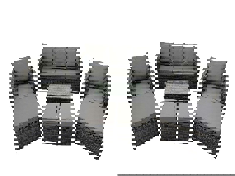 Create a refined outdoor seating area with this modern deluxe rattan garden furniture set, designed for relaxed entertaining across the garden, patio or conservatory. With cushions included and shaped to suit the sofa and chairs, it offers a comfortable place to unwind, while the tempered glass tabletop provides a practical surface for drinks and snacks.
