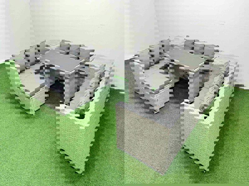 Made with PE rattan and sturdy galvanised steel tube frames with a powder coating to help prevent rust, this set is built for frequent outdoor use. It is finished in light grey mixed rattan with dark grey fabric, and includes a black tempered glass dining table top for a sleek, practical surface.