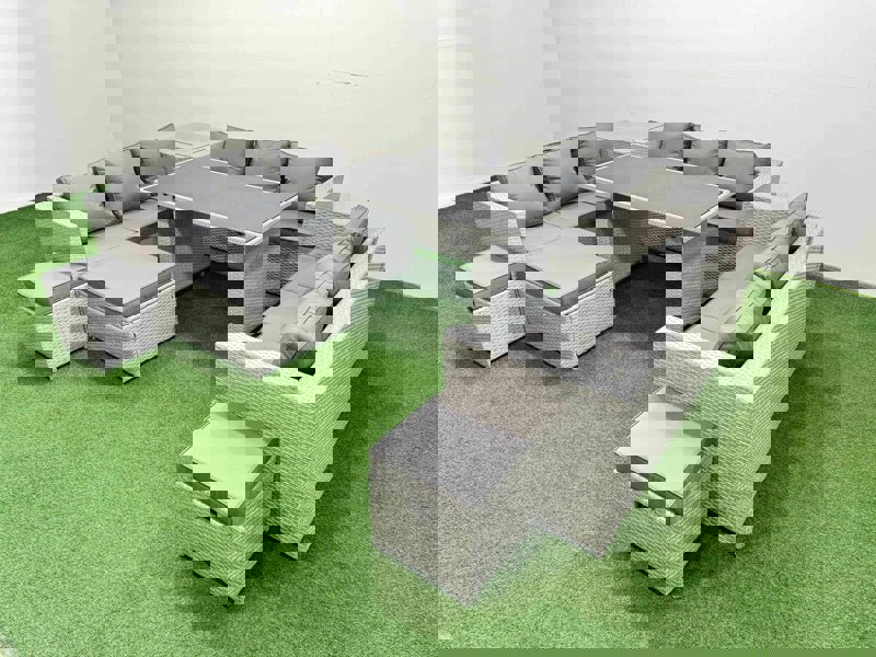 Create a refined outdoor setting for relaxed entertaining with this spacious patio furniture set. Designed for gardens, patios or pool areas, the modular layout lets you arrange the pieces to suit your space and the occasion. Finished in light grey mixed rattan with dark grey fabric, it brings a coordinated look to outdoor dining and lounging.