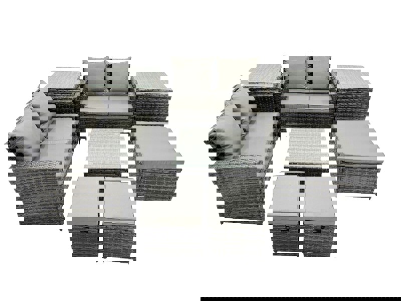 Presented in dark grey mixed rattan with dark grey fabric, the set includes sofas, tables and footstools for flexible lounging and entertaining. Seat cushions are 8cm thick, paired with soft pillow back cushions for added comfort, while removable cushion covers support low-maintenance care.