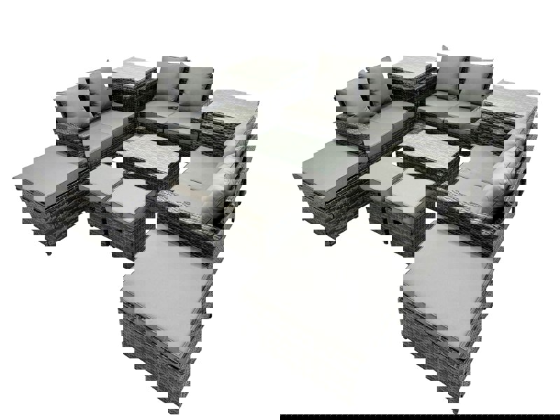Finished in dark grey mixed rattan with dark grey fabric, the set includes multiple seating and table pieces for flexible layout options. Cushions are included for added comfort, with removable covers to support low-maintenance everyday use.
