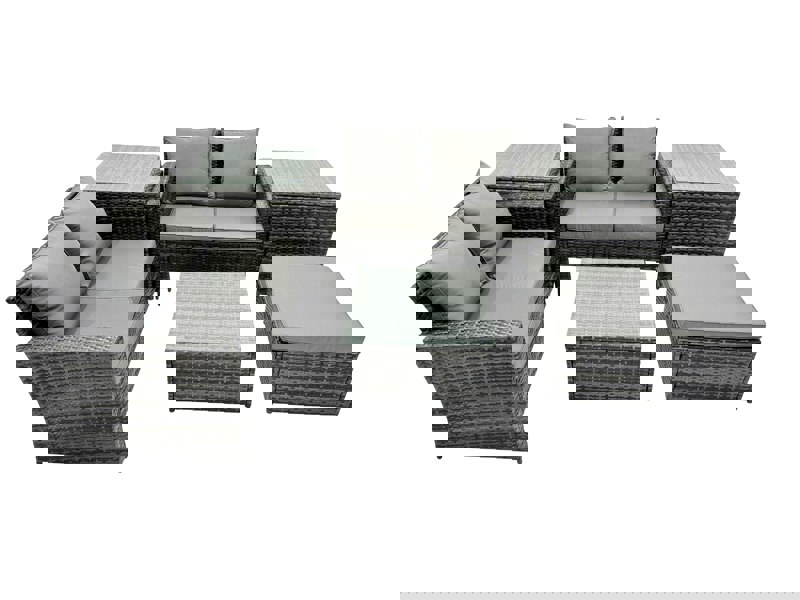 Finished in dark grey mixed rattan with dark grey fabric, the set includes sofas, tables and a large footstool, with comfortable cushions to help you settle in. It arrives flat packed for easy assembly and can be kept outdoors all year round.