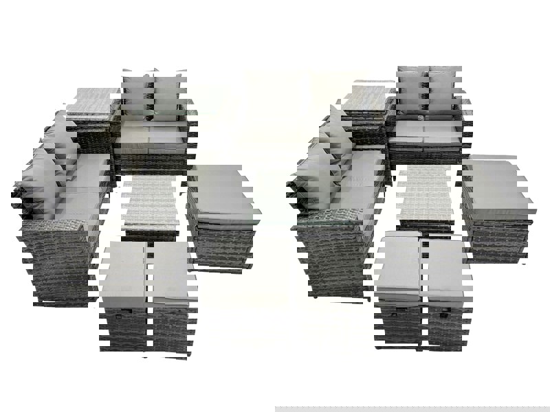 Finished in dark grey mixed rattan with dark grey fabric, the set includes cushioned seating for added comfort, plus tables for serving drinks and snacks when entertaining or relaxing.