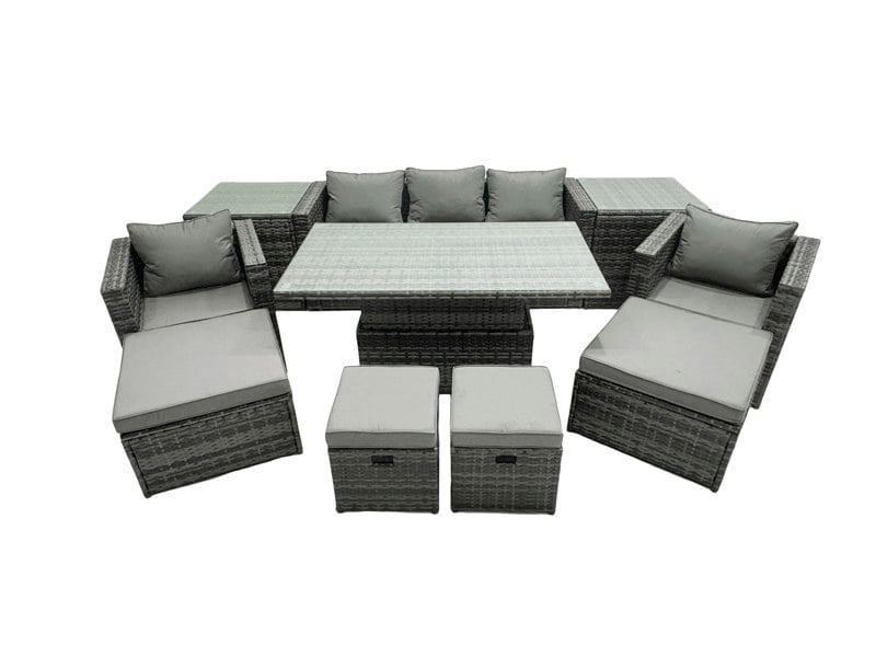 With a rising dining table that can be used as both a coffee table and a dining table, the set adapts easily to relaxed mornings, informal entertaining and evening dining. Dark grey mixed rattan is paired with dark grey fabric, while thick seat cushions and soft back pillows add comfort for everyday lounging.