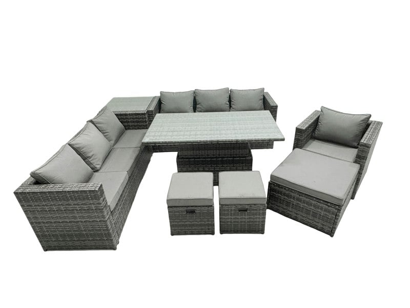 Bring a refined, modern look to your outdoor space with this PE rattan garden furniture set, designed for relaxed lounging and flexible entertaining. With a rising dining table that can be used as either a coffee table or a dining table, it adapts easily to everything from casual drinks to outdoor meals.