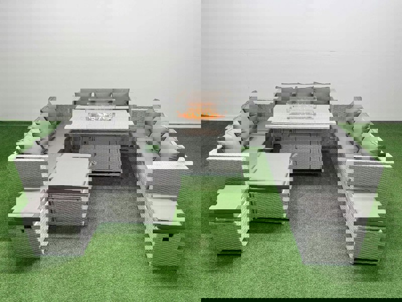 Create a refined outdoor setting with this PE rattan lounge sofa set, designed for relaxed garden seating and sociable dining. The set pairs light grey mixed rattan with dark grey fabric, centred around a fire pit dining table for comfortable evenings outdoors.