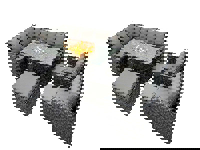 Crafted with high quality PE rattan and a durable galvanised steel construction, the set is made for everyday use. Comfort is enhanced with generously padded seat and back cushions, while the fire pit dining table is finished with tempered glass secured with suckers to help prevent sliding.