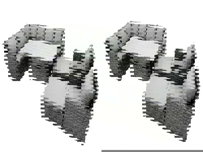 Crafted with flat PE rattan that is entirely handwoven and supported by durable galvanised steel tube frames, the set is made for lasting use. The rising dining table adapts to your plans, working as both a coffee table and a dining table, while supportive high-back, reclining seating and generously cushioned pads enhance comfort.