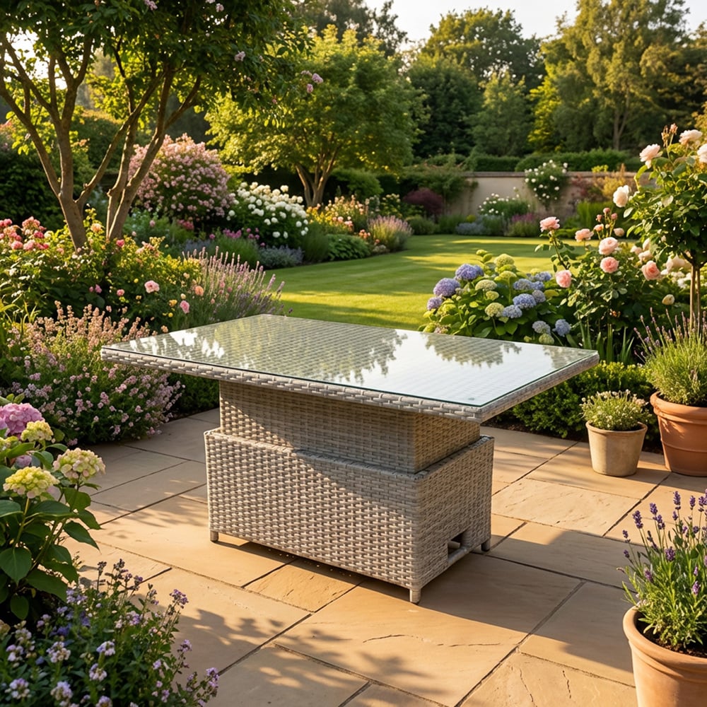 Designed for flexible outdoor living, this adjustable rising table moves easily between coffee and dining height to suit relaxed mornings and sociable evenings. Finished in a light grey mixed PE rattan with a clear tempered glass top, it offers a clean, contemporary look for both indoor and outdoor settings.
