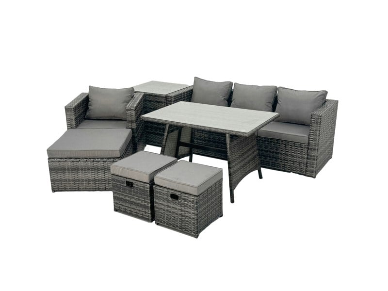 Designed for relaxed outdoor living, this heavy-duty rattan dining and lounging set brings together a sofa, armchair, dining table, side table and footstools in a coordinated look. Finished in dark grey mixed rattan with dark grey fabric, it offers a practical, low-maintenance setup for everyday use in the garden.