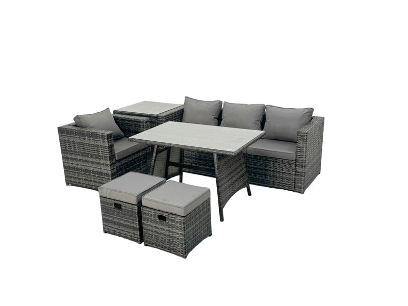 Finished in dark grey mixed rattan with dark grey fabric, the set features a weatherproof construction and low-maintenance design, making it easy to enjoy outdoors throughout the seasons.