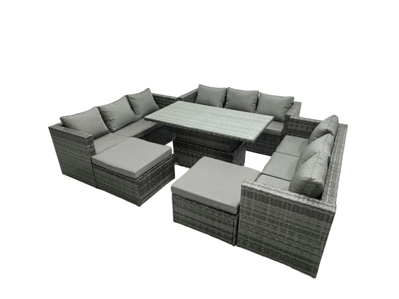 Finished in dark grey mixed rattan with dark grey fabric, the set includes a rising dining table that can be used as a coffee table or a dining table, giving you flexible styling for different occasions.