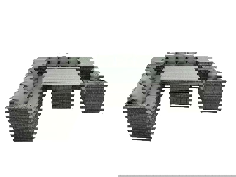 This outdoor rattan furniture set brings a sleek, modern look to patios, balconies and gardens, with a practical layout designed for everyday lounging and outdoor dining. With a rising dining table, it easily adapts between coffee and dining use, making it ideal for relaxed mornings and sociable evenings alike.