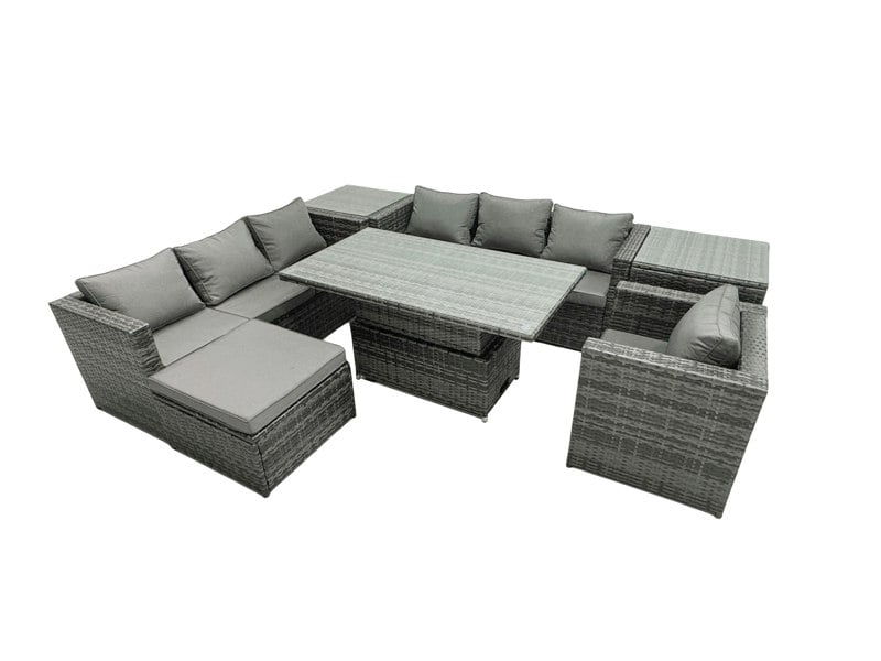 Crafted with PE rattan and supported by galvanised steel tube frames with a powder coating to help prevent rust, the set is made for outdoor use. Dark grey mixed rattan is paired with dark grey fabric cushions, including 8cm thick seat cushions and soft pillow back cushions for added comfort.