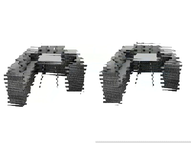 Finished in dark grey mixed rattan with dark grey fabric, the set includes a dining table and side tables for convenient serving and everyday practicality. The furniture arrives flat packed for straightforward assembly.