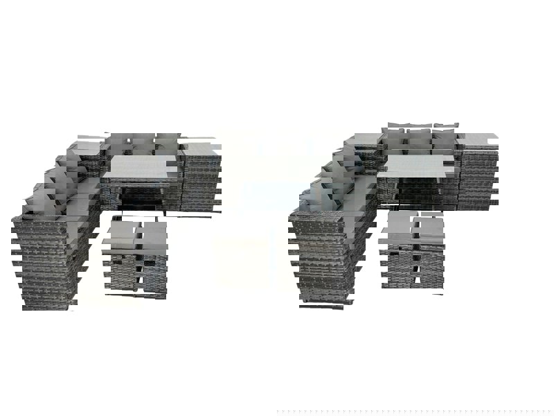 This outdoor rattan dining and sofa set is designed for relaxed garden or balcony living, with cushioned seating for supportive comfort. Finished in dark grey mixed rattan with matching dark grey fabric, it creates a coordinated look for everyday lounging and casual dining.