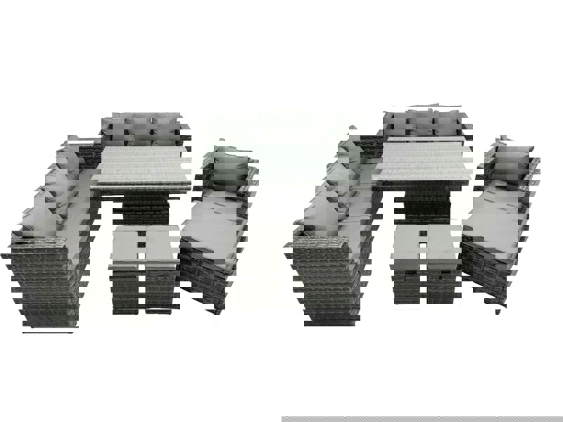 Bring a refined, modern look to your outdoor space with this rattan dining and lounge set, designed for flexible everyday use. The rising dining table can be used as a coffee table or a dining table, making it easy to adapt for relaxed drinks, casual meals, or entertaining.