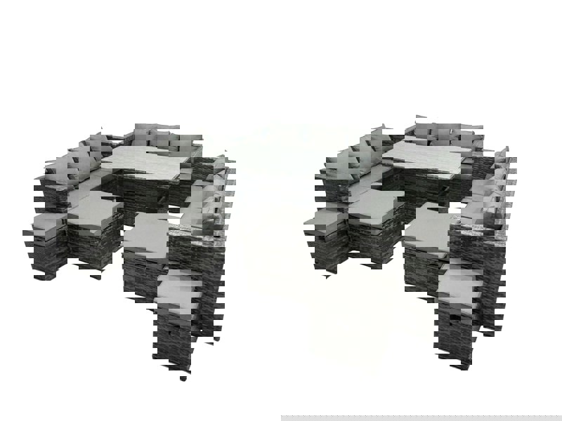 Finished in dark grey mixed rattan with dark grey fabric, this set combines a hand-finished look with practical features for outdoor use. The seat cushions are 8 cm thick, paired with soft pillow back cushions for added comfort.