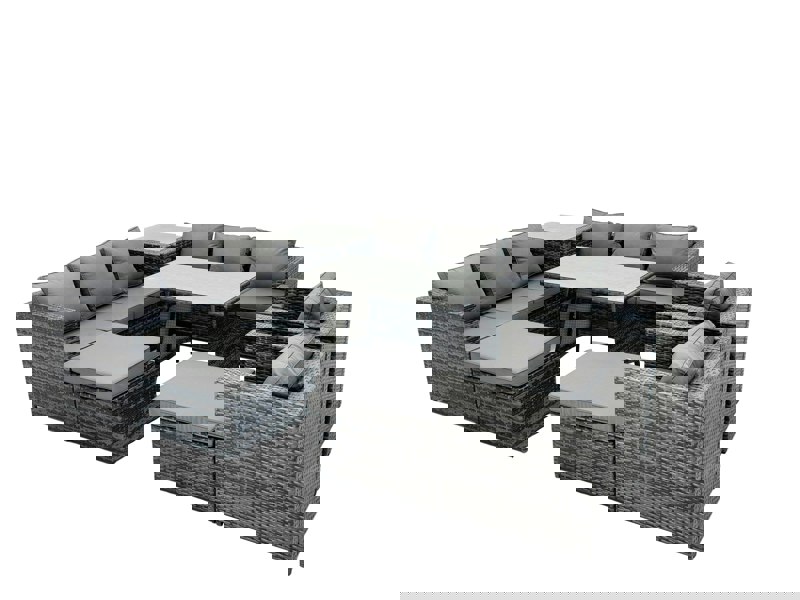 Finished in dark grey mixed rattan with dark grey fabric, the set is supplied flat packed for easy assembly. Hand-made flat PE rattan and galvanised steel tube metal frames with a powder coating help provide a sturdy, considered finish, while the dining table features 5mm transparent tempered glass with suckers to help prevent sliding.