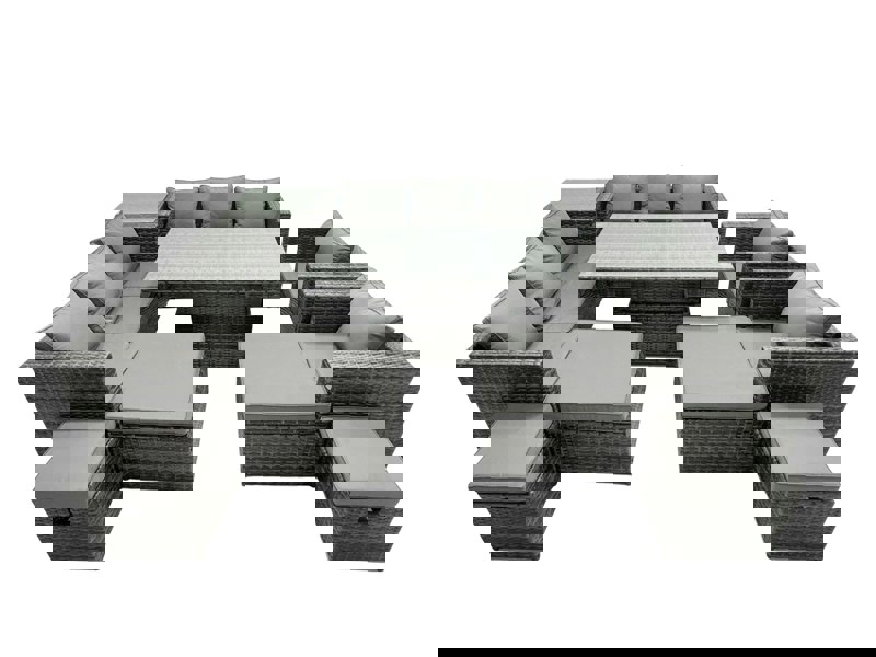 The Fimous rattan dining table sofa set brings a sleek, modern look to outdoor living, designed to suit everything from urban balconies to country gardens. Finished in dark grey mixed rattan with dark grey fabric, it offers a coordinated setting for relaxing and dining in the open air.