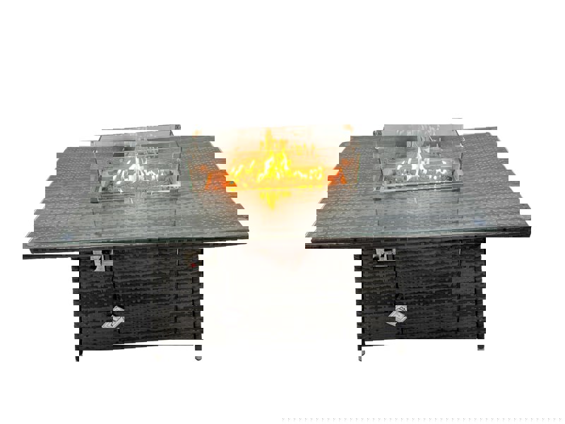 Designed for relaxed outdoor entertaining, this rattan garden furniture set brings together generous seating, a side coffee table and a firepit table for a versatile patio layout. Finished in dark grey mixed rattan with dark grey fabric, it offers a coordinated look for gardens and terraces.