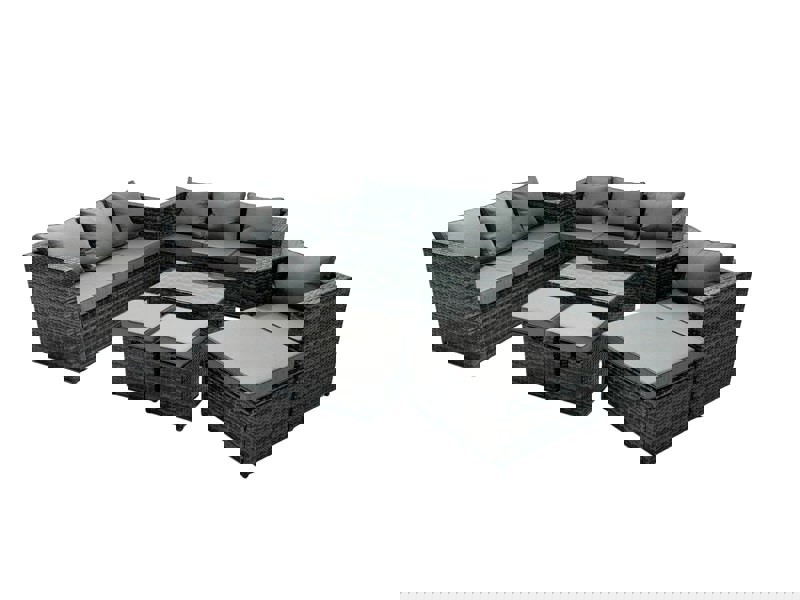 Finished in dark grey mixed rattan with dark grey fabric, the set is supplied flat packed for easy assembly. Hand-made flat PE rattan, supportive cushions and a tempered glass coffee table top complete a practical layout for entertaining, lounging and flexible seating.