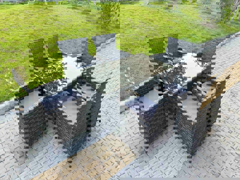 Crafted from dark grey woven PE rattan with a galvanised steel frame, the set is made for outdoor use, with an anti-rust powder coating for lasting performance. The table is finished with a 5mm black tempered glass top, while the chairs include seat cushions with removable covers for easier cleaning.