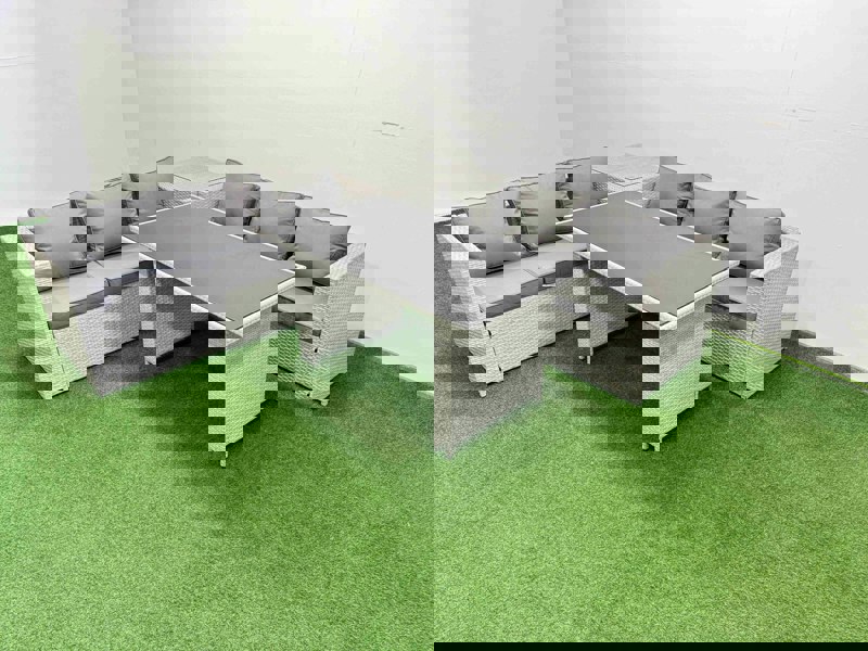 Designed to make the most of your outdoor space, this rattan garden furniture dining set offers flexible configurations to suit anything from compact porches to larger gardens. Finished in light grey mixed rattan with dark grey fabric, it creates a coordinated look for relaxed lounging and outdoor dining.