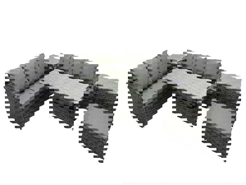 Create a refined outdoor setting with this PE rattan sofa set, designed for relaxed lounging and flexible dining in the garden or on the patio. With a rising dining table that adjusts between 2 heights, it transitions easily from coffee table to dining table, making it ideal for everyday use and entertaining.