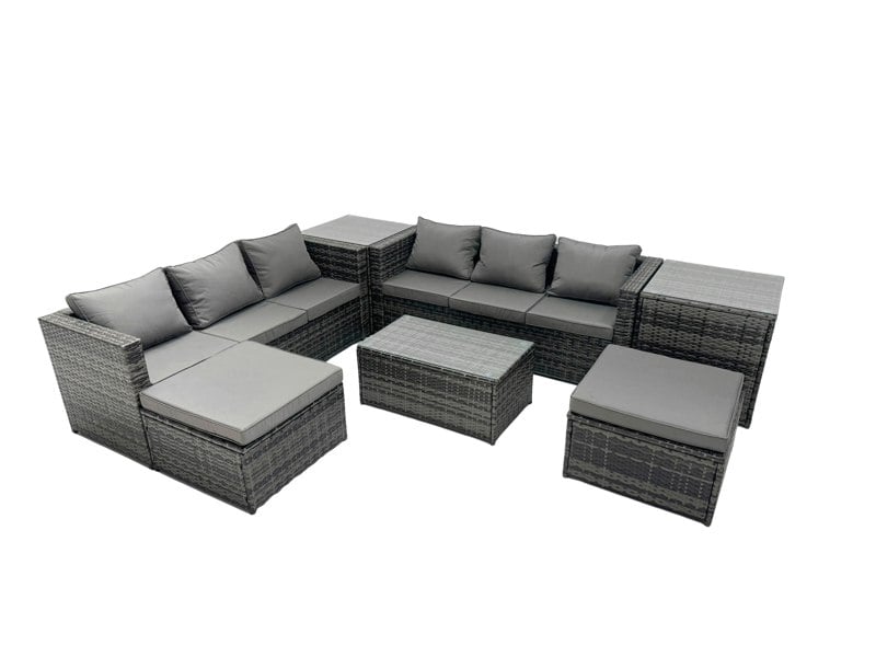Finished in dark grey mixed rattan with dark grey fabric, the set is supplied flat packed for straightforward assembly. Practical details such as removable cushion covers, tempered glass table tops and supportive cushions help make outdoor hosting feel effortless, while the modular pieces are easy to move to suit your space.