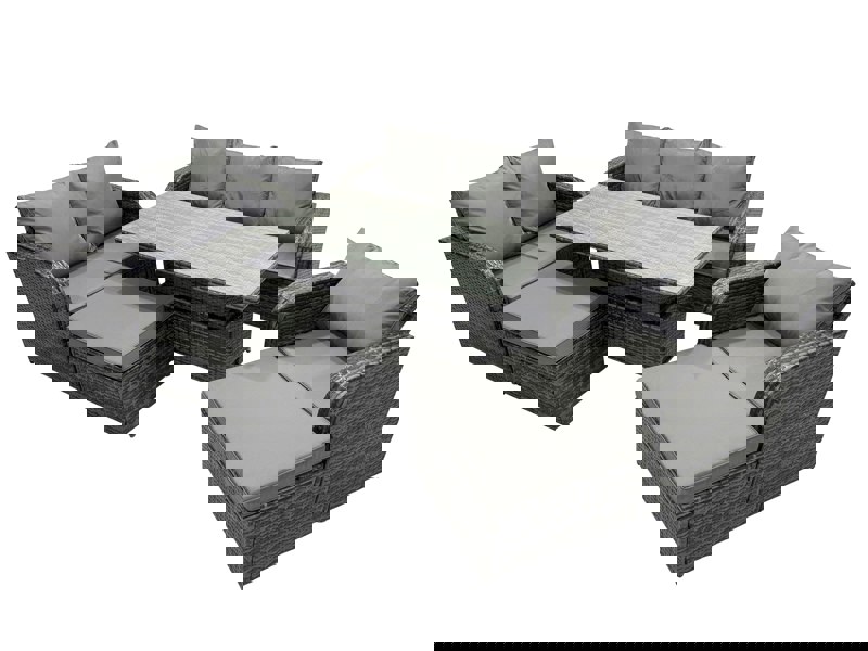 Finished in dark grey mixed rattan with dark grey fabric, the set includes a rising dining table that can be used at different heights, alongside an adjustable reclining chair for personalised lounging. The tempered glass tabletop is secured with suckers to help prevent sliding, while the furniture arrives flat packed for straightforward assembly.
