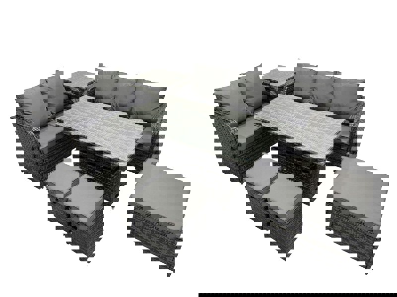 The rising dining table adjusts between coffee and dining height, while the ergonomic high-back, reclining design supports comfortable seating. Finished in dark grey mixed rattan with dark grey fabric, this set is crafted by hand and supplied flat packed for assembly.
