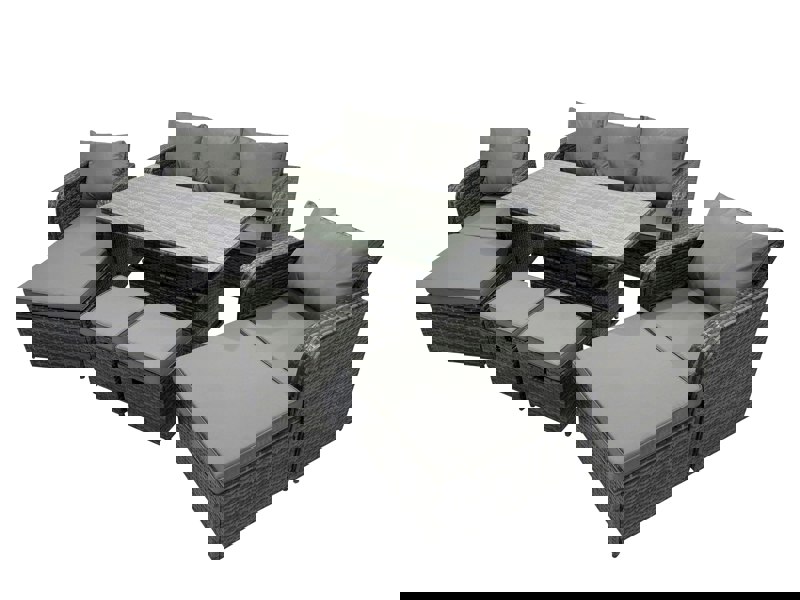 The set includes adjustable reclining chairs and a rising dining table that can be used as either a coffee table or a dining table. Finished in dark grey mixed rattan with dark grey fabric, it is made for relaxed lounging, casual dining and entertaining.