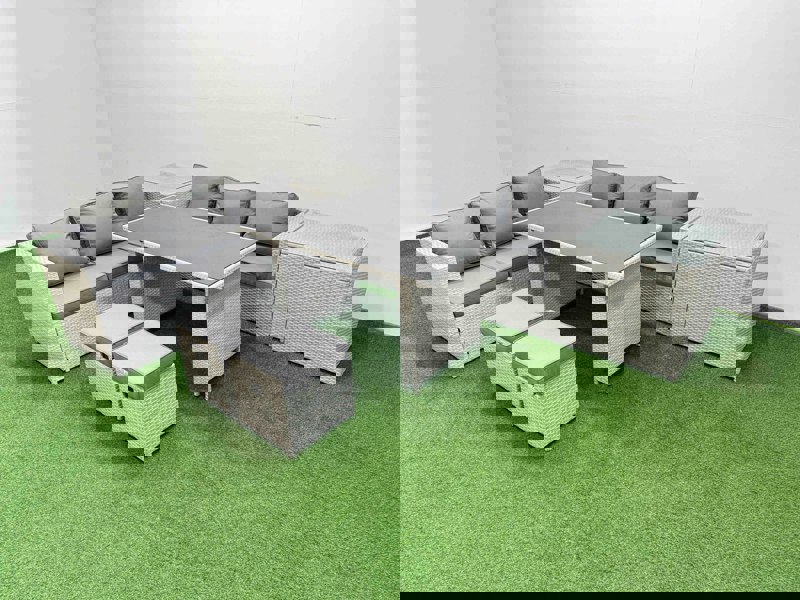 Designed to make the most of your outdoor space, this rattan garden furniture set offers flexible configurations to suit everything from compact porches to larger gardens. With a rectangular dining table, sofas, side tables and stools, it creates a comfortable setting for relaxed dining and everyday lounging.