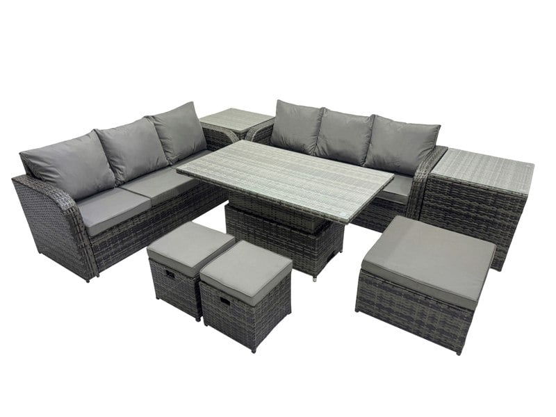 Create a refined outdoor seating and dining area with this PE rattan sofa set, designed for garden and patio living. With a rising dining table that adjusts between 2 heights, it transitions easily from relaxed coffee moments to outdoor meals, while the high-back, reclining design is shaped for comfortable lounging.