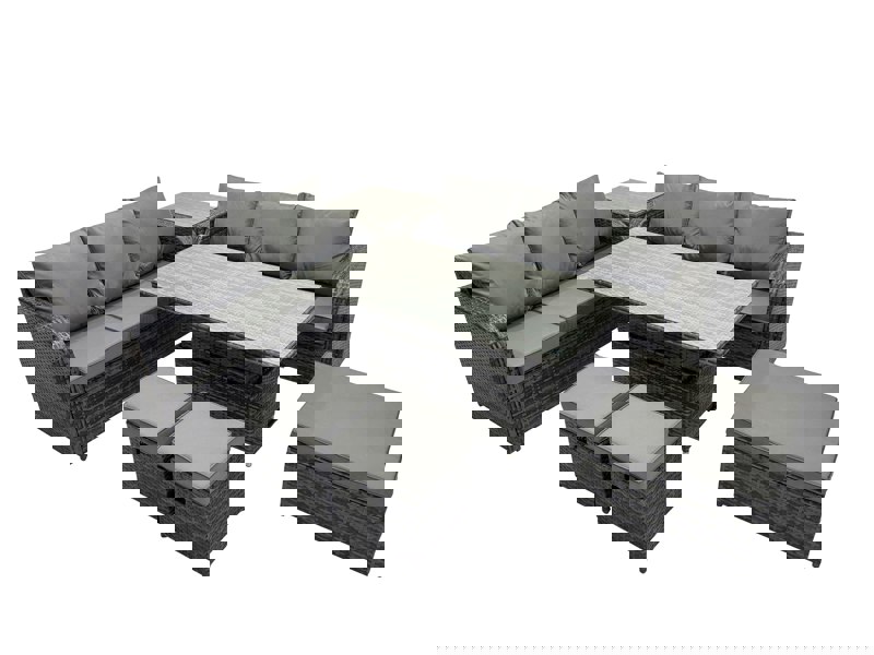Create a refined outdoor setting with this PE rattan sofa set, designed for relaxed lounging and flexible dining in the garden or on the patio. With a rising dining table that adjusts between 68cm and 48cm in height, it transitions easily from coffee table to dining table, while the side table and footstools complete the layout for everyday entertaining.