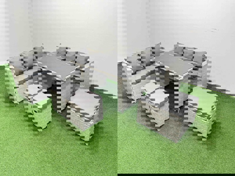 Designed to make the most of your outdoor space, this rattan garden furniture dining set offers flexible arrangements for everything from compact patios to larger gardens. With a rectangular dining table, sofas, stools and a footstool, it creates a comfortable setting for relaxed meals and everyday lounging.