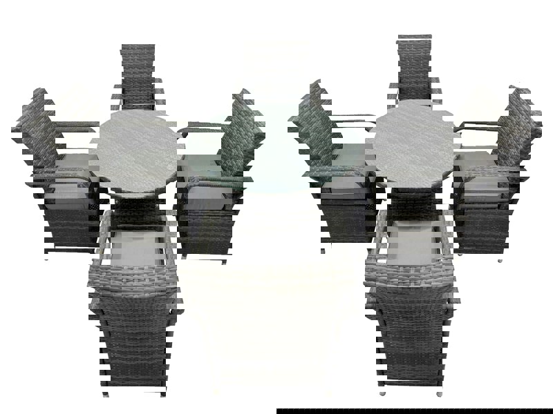 Finished in a dark grey mix rattan with matching dark grey cushions, it includes a tempered glass tabletop for a clean, practical surface. Cushion covers are machine washable, while the fabric itself is not waterproof and should be kept indoors when not in use.