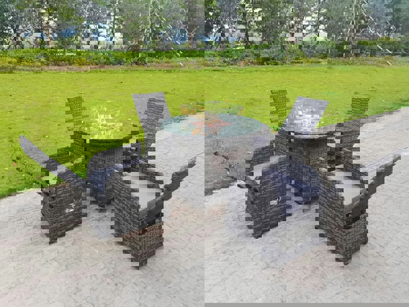 Create a refined outdoor dining and lounging space with this 4 seater rattan garden furniture set, complete with a round gas fire pit table. Designed for relaxed entertaining, the set pairs adjustable reclining armchairs with a statement centrepiece table, offering comfort and atmosphere for evenings outdoors.