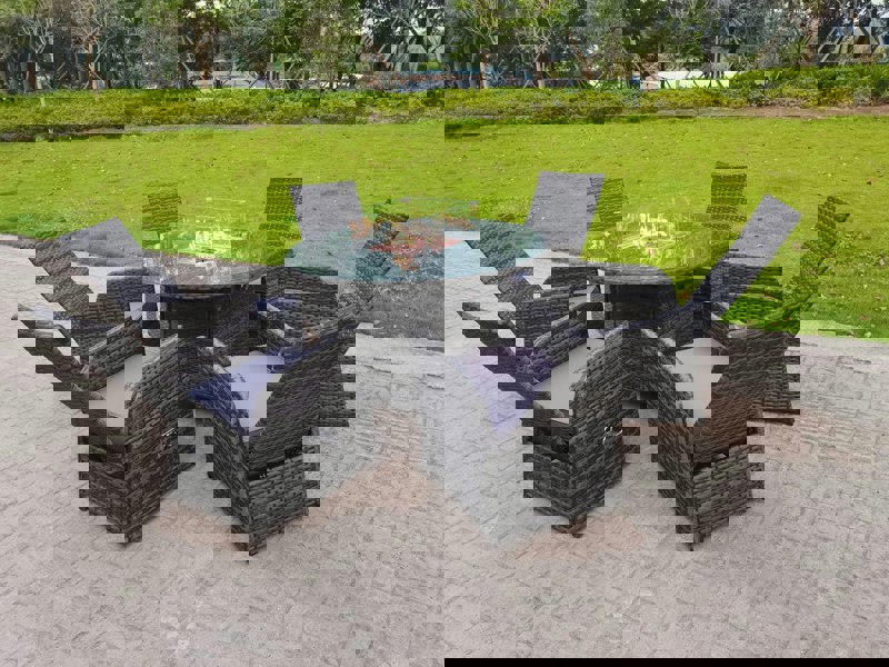 This outdoor rattan furniture set brings together 6 reclining armchairs and a round gas fire pit table for relaxed dining and entertaining in your garden or patio. Designed for comfort and flexibility, the chairs feature an adjustable backrest so you can change your seating position with ease.