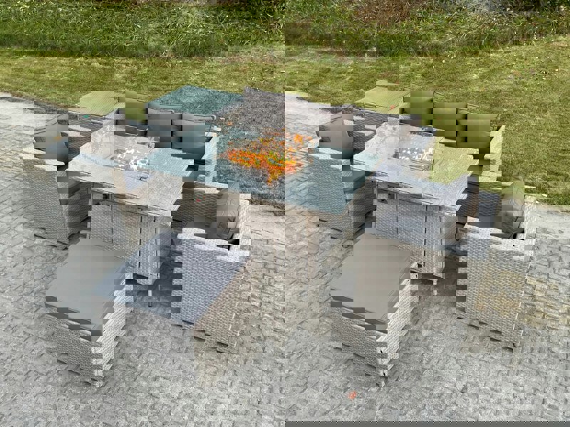 Create a refined outdoor seating area with this rattan garden furniture set, designed for relaxed entertaining and everyday lounging. The set includes a gas fire pit table alongside coordinated seating and tables, offering a practical centrepiece for social moments in the garden.