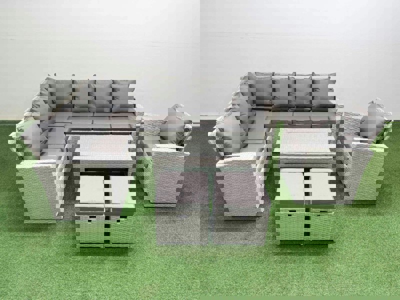 Finished in light grey mixed rattan with dark grey fabric, the set includes an ergonomic high back and a reclining design for added comfort. The oblong coffee table is topped with 5mm thick transparent tempered glass, secured with suckers to help prevent sliding.