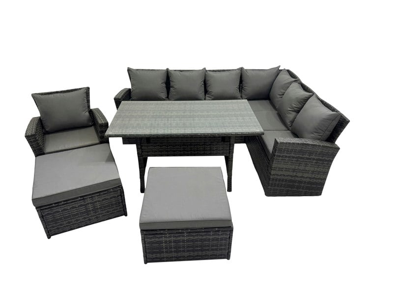 Create a refined space for dining and lounging with this rattan corner sofa set, designed for both indoor and outdoor use. Finished in dark grey mixed rattan with matching dark grey fabric, it brings a considered balance of country chic and modern minimalism to patios, balconies and home settings.